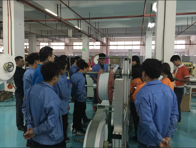 陳組長(zhǎng)對(duì)本公司口罩系列有著豐富的經(jīng)驗(yàn),主要講解了公司的平面口罩設(shè)備產(chǎn)品性能和運(yùn)用范圍,比如性能方面:公司的口罩機(jī)用的是日本、韓國(guó)元器件,該設(shè)備是由程序控制完成自動(dòng)化生產(chǎn),操作簡(jiǎn)單,通過(guò)超聲工藝來(lái)制造平面口罩,是生產(chǎn)平面口罩的設(shè)備,從原材料入料到生產(chǎn)成品均為自動(dòng)化作業(yè), 材料的層級(jí)可以從一層材料到七層材料,因?yàn)槭浅暡üに?材料起碼要包含30%以上的化纖;平面口罩機(jī)主要分為內(nèi)耳帶和外耳帶還有綁帶的較為運(yùn)用的多,設(shè)備一般由一臺(tái)本體機(jī)加一臺(tái)或者多臺(tái)上耳帶機(jī)拼接;可根據(jù)客戶的要求進(jìn)行添加耳帶焊接機(jī)的類(lèi)型.